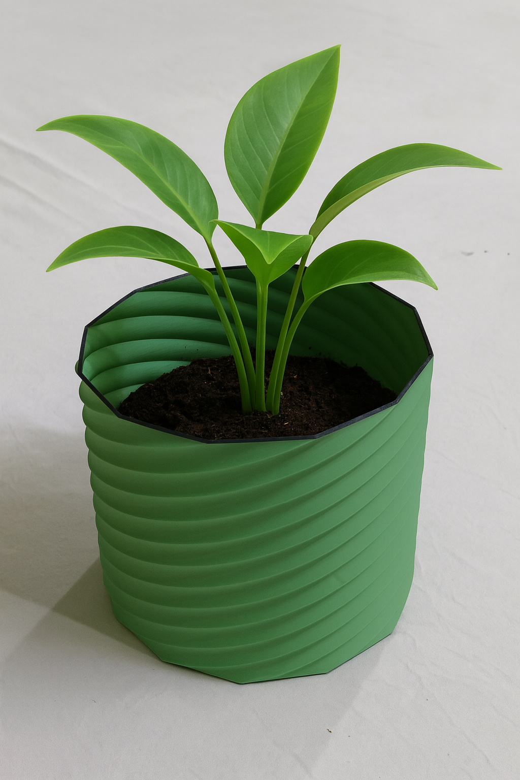 This 3D-printed planter showcases a sleek ribbed design with a modern geometric shape.