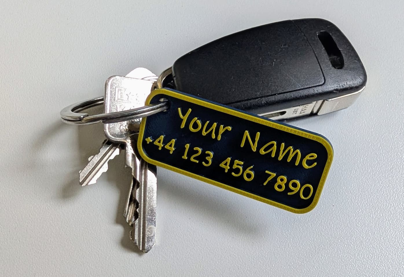 A sleek 3D-printed personalised name keyring. Perfect for schools, offices, and events.